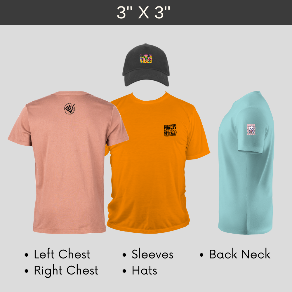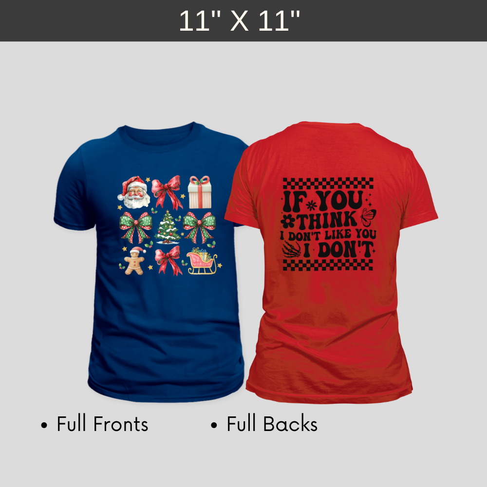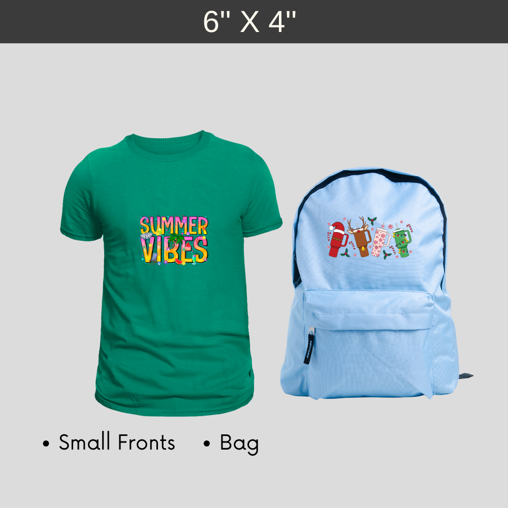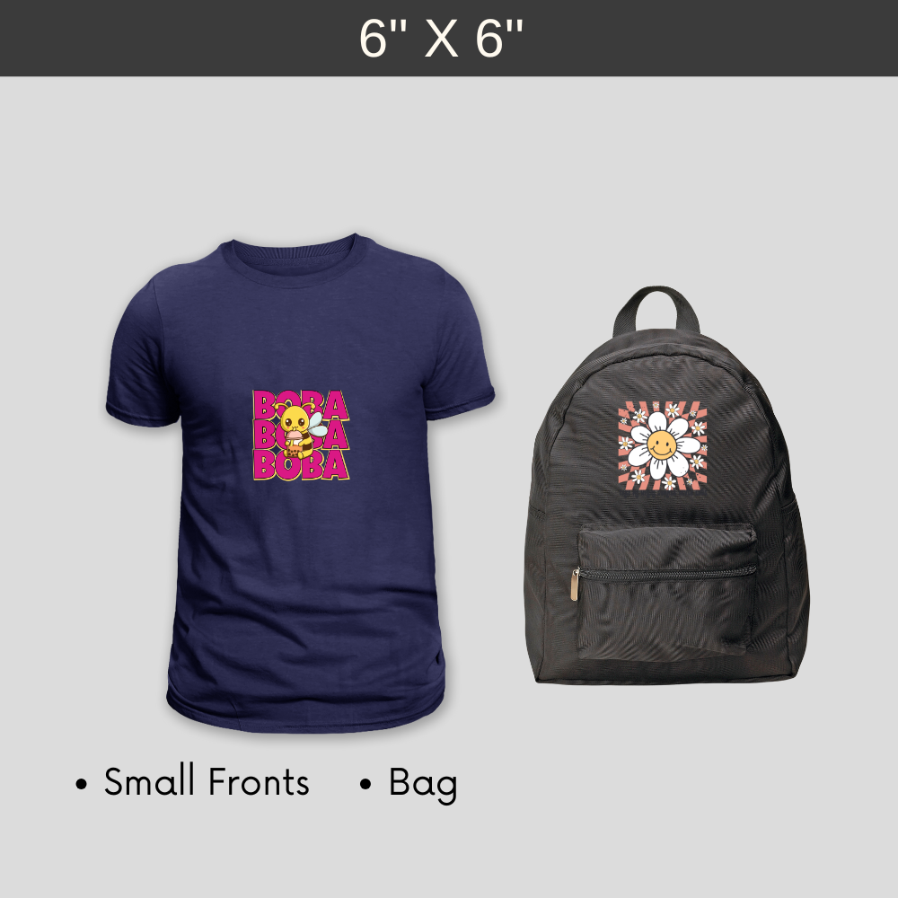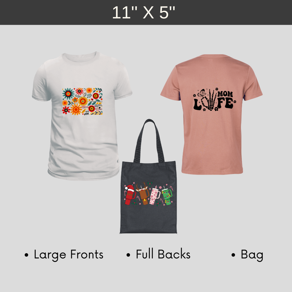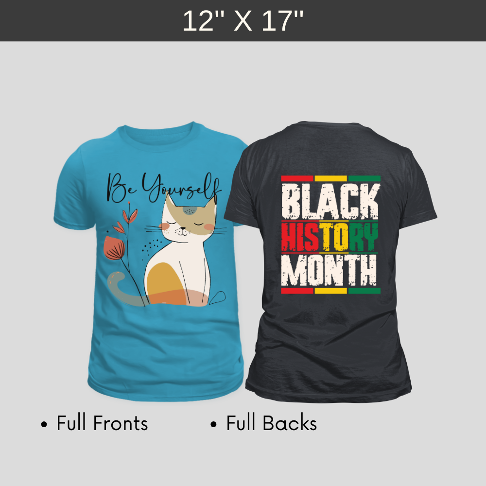 DTF Design's custom DTF transfers are printed on high-quality gang sheets ranging in sizes from 2" x 2" to 12" x 17", designed to showcase vibrant, full-color graphics, detailed photo prints, gradient/ombre effects, and other stunning visual elements. Each transfer is printed using durable, crack-resistant inks on premium DTF film, ensuring lasting quality and performance. DTF transfers are ideal for both light and dark-colored garments, offering full-color, heat-applied designs that require no weeding or masking, and are compatible with cotton, cotton/poly blends, and 100% polyester fabrics. However, DTF transfers are not recommended for nylon fabrics, as their smooth texture prevents the adhesive from bonding effectively with the fabric fibers.