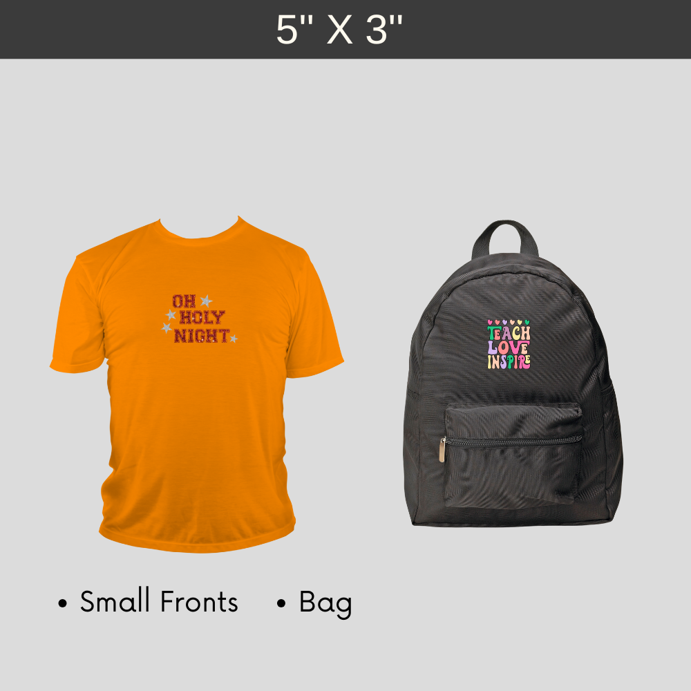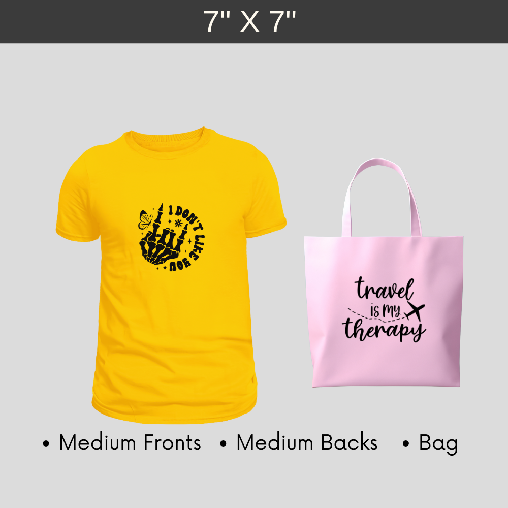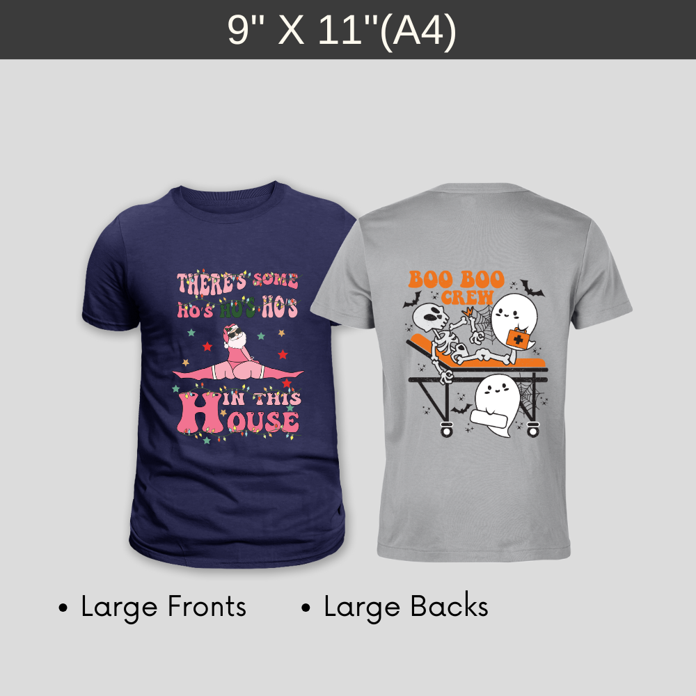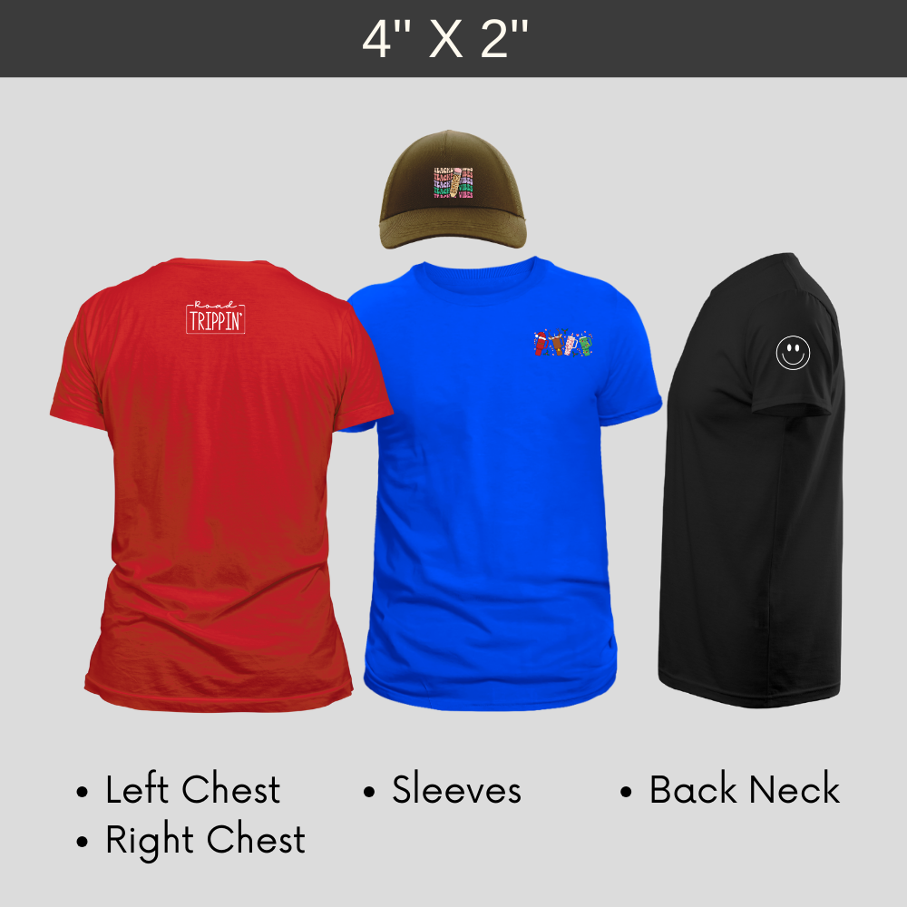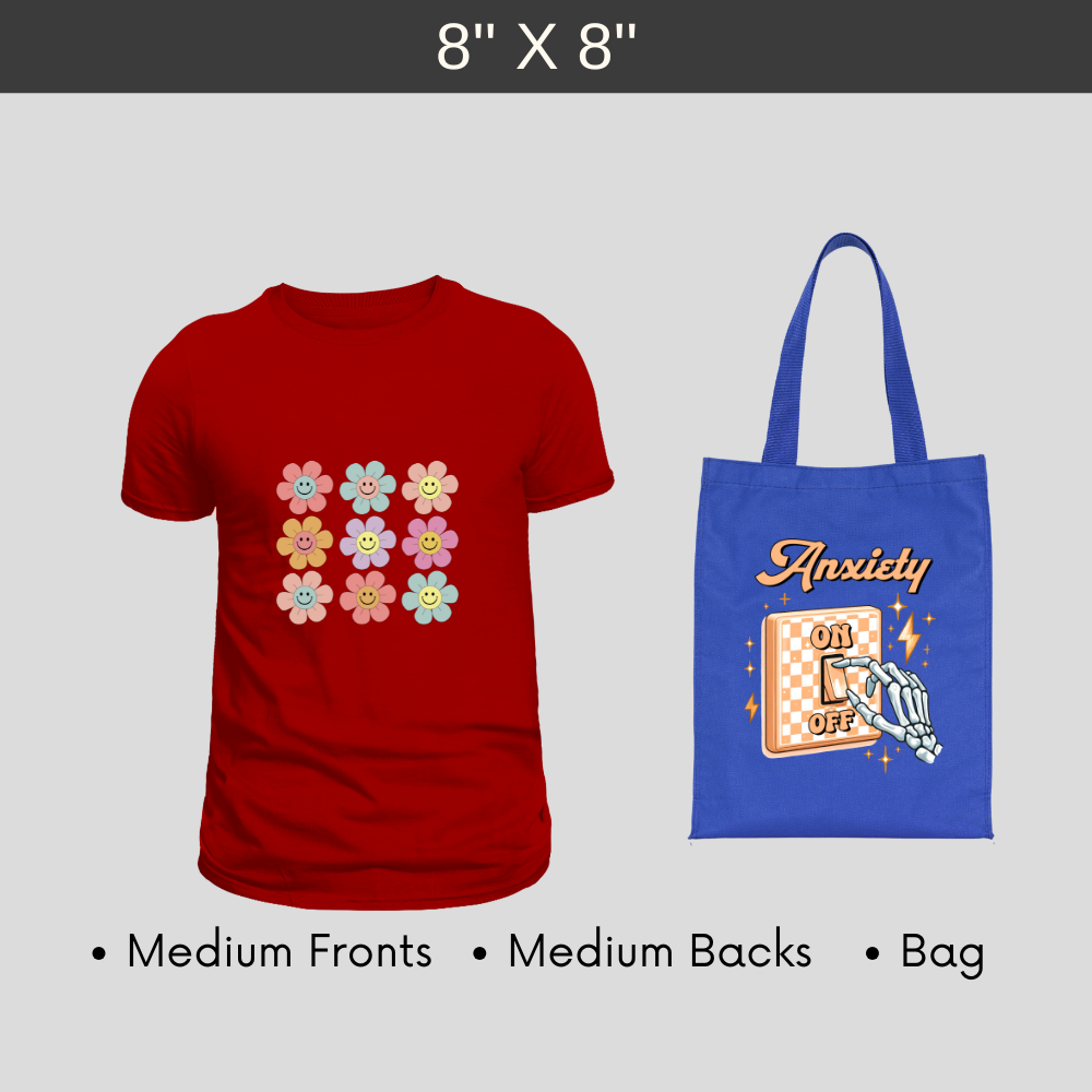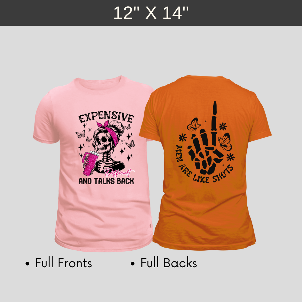 DTF Design's custom DTF transfers are printed on high-quality gang sheets ranging in sizes from 2" x 2" to 12" x 17", designed to showcase vibrant, full-color graphics, detailed photo prints, gradient/ombre effects, and other stunning visual elements. Each transfer is printed using durable, crack-resistant inks on premium DTF film, ensuring lasting quality and performance. DTF transfers are ideal for both light and dark-colored garments, offering full-color, heat-applied designs that require no weeding or masking, and are compatible with cotton, cotton/poly blends, and 100% polyester fabrics. However, DTF transfers are not recommended for nylon fabrics, as their smooth texture prevents the adhesive from bonding effectively with the fabric fibers.